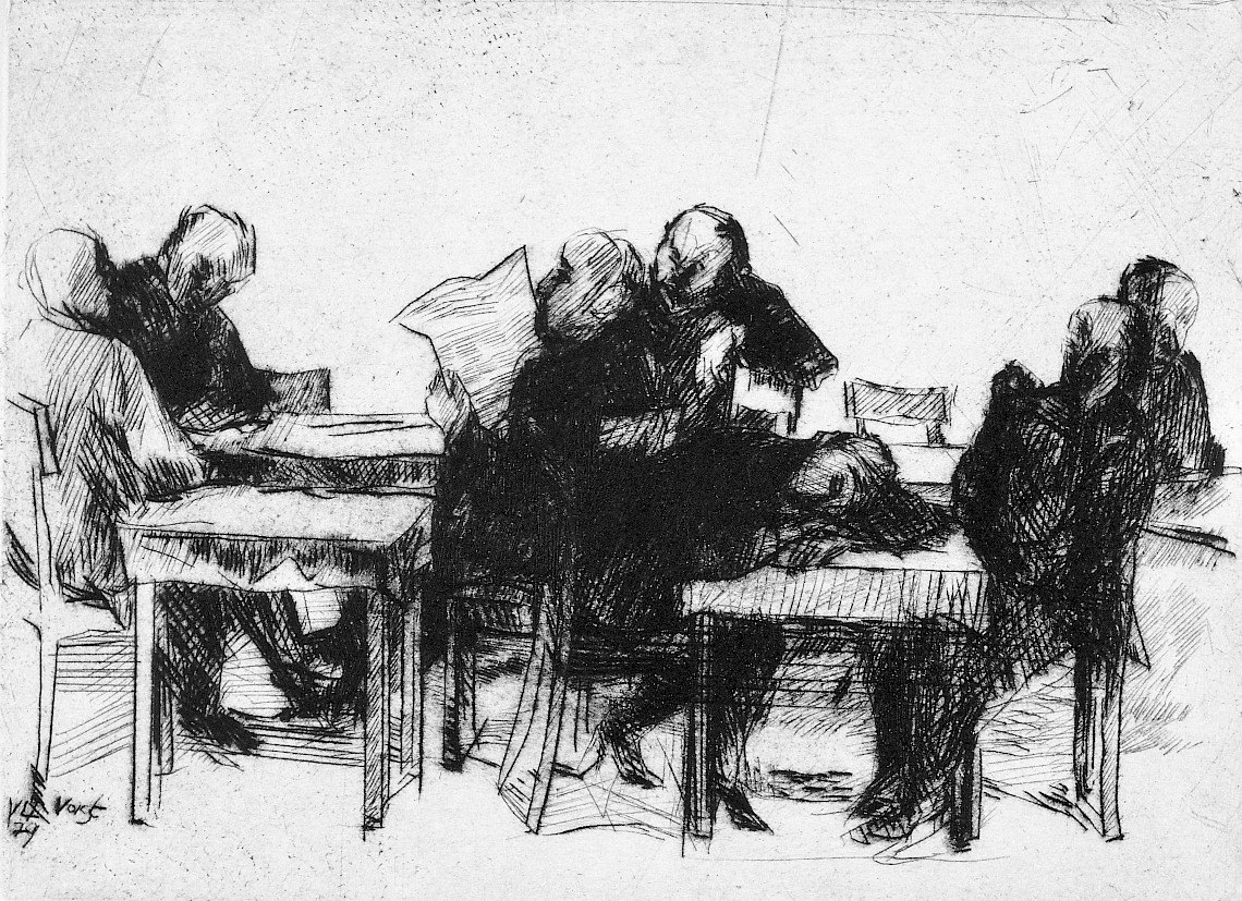 ![]() Kleine Gesellschaft, 1979 Kaltnadelradierung, Tiefdruckfarbe auf Büttenpapier 14,5 cm x 20 cm |