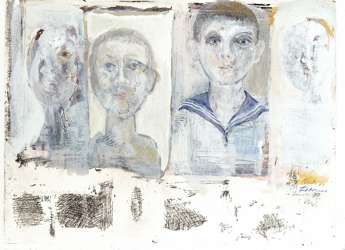 ![]() Tagebuch II, (1967) übermalt 1970er Jahre Tiefdruckfarbe und Gouache auf Büttenpapier (Radierung übermalt) 20 cm x 29,5 cm |